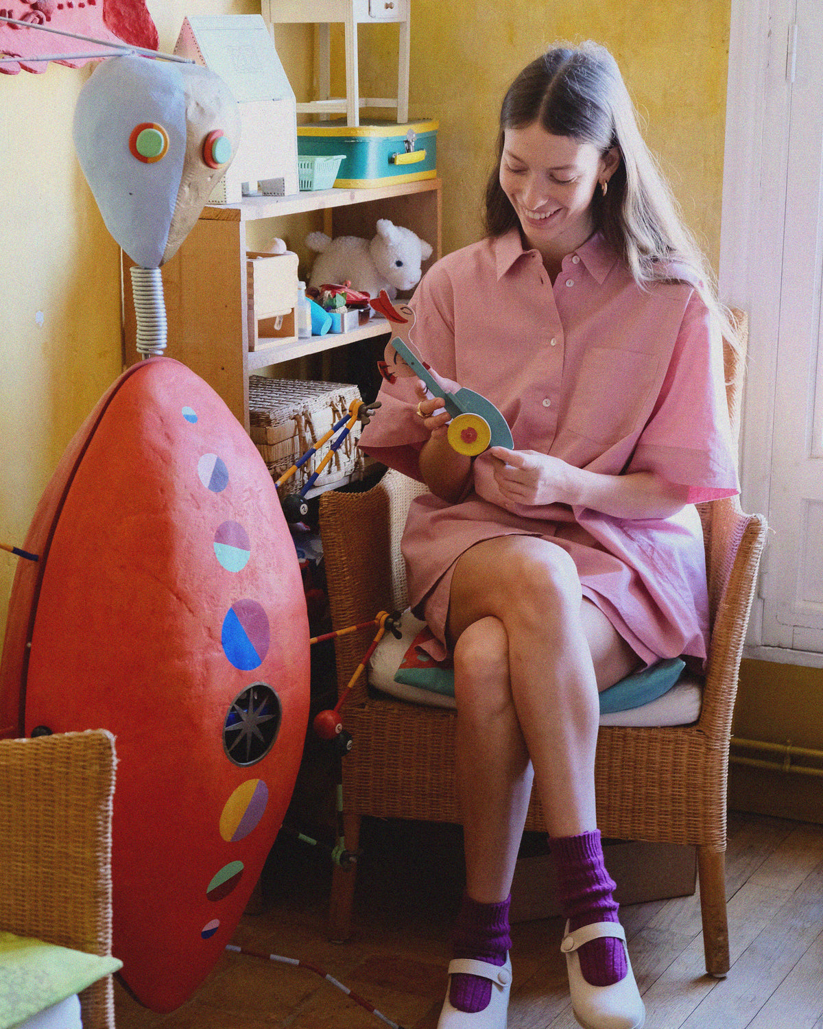 “I have so many magical memories from my childhood. For example, this little cabinet. It is a robot in papier maché with a door in the middle of the stomach. The knitted children´s hats from my childhood are still inside. See.” The little door in the cabinet reveals the most beautiful, knitted hats in different styles and colours. “My parents made it for a shoot for Marie Claire and afterwards they felt that we had to use it for something, so it came in here.”