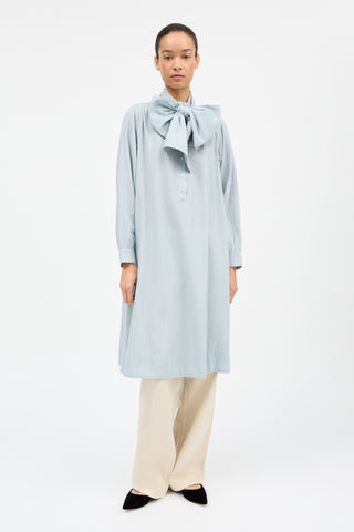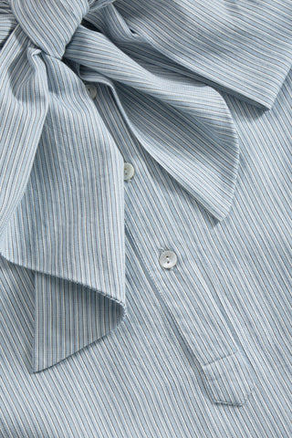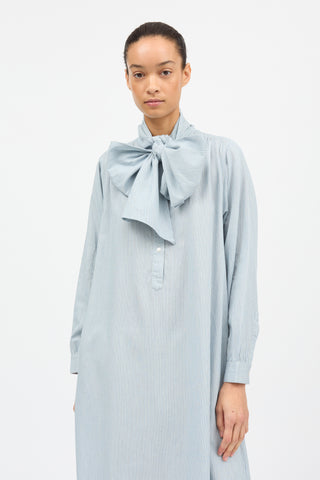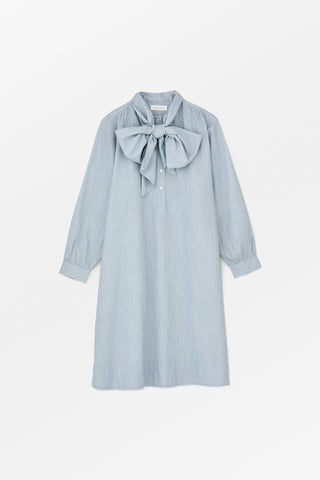 Dalia Bow Dress is an easy fit shirt dress that falls to just below the knee. There is a buttoned half placket at the front and the double layer scarf collar can be tied in a big bow or left more relaxed as a scarf. Made from 100% organic cotton in a fine blue stripe, the dress has buttoned cuffs and a deep hem as sophisticated finishing touches.