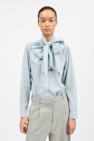 Dalia Bow Shirt is a feminine and chic take on a traditional blouse. The double layer scarf that forms the collar can be tied into a large bow at the front or left as a free-flowing scarf. The shirt is made from 100% organic cotton and has buttons at the front and cuffs.