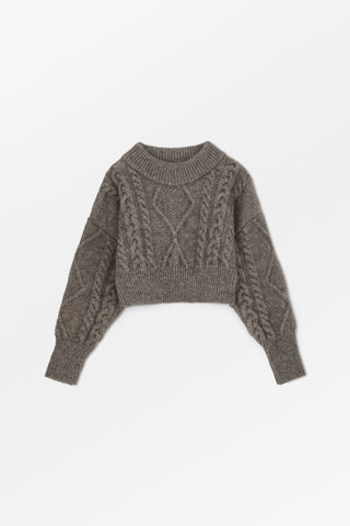 Cropped cable-knit sweater with deep round neck, dropped shoulders and ribbed edges.