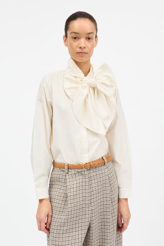 Lady Bow Shirt has a voluminous and feminine collar that ties in a large bow at the front, or which can be styled as a scarf. The shirt is made from 100% organic cotton and fastens with buttons at the front and cuffs.