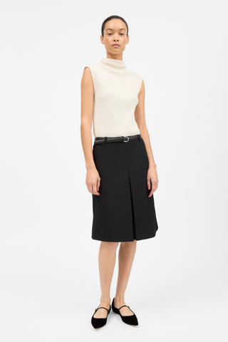 Miles Skirt is a knee-length skirt made from 100% wool. It flares gently from the hips with a large, inverted pleat at the front, creating a soft A-line shape. It fastens with a concealed zipper and there are side pockets and belt loops at the waistband.